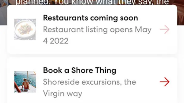 Sailors traveling in standard cabins can use the Virgin Voyages app to reserve dining 45 days prior to departure (60 days for those booked in Rockstar and Mega Rockstar Quarters). Shore Things (Virgin's term for excursions) are also bookable on the app prior to sailing (120 days for standard cabins, or 135 for Rockstar and Mega Rockstar sailors).