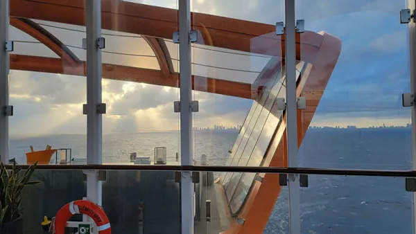 Alright, we may be mixing song lyrics here, but it is how we started our cruise. Celebrity Apex has a large orange venue cantilevered over the side of the ship. This place, called the Magic Carpet, is positioned on different decks depending on the purpose. For sail-away today, it was positioned on deck 14, and this seemed an excellent place to watch us leave Ft Lauderdale behind us.