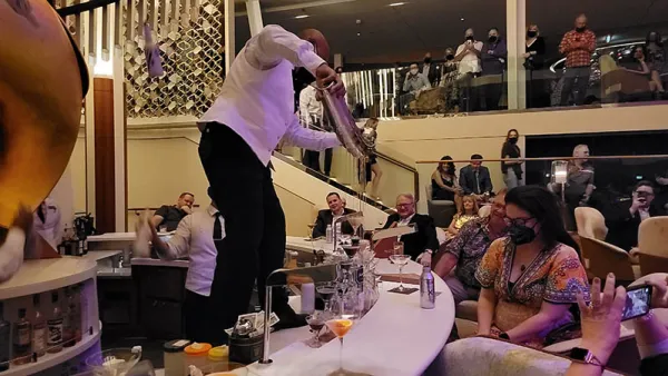 On this night, from above at Fine Cut (and then later from right at the bar), we watched the bartenders juggling, dancing in sync, and then pouring a large stack of martinis all at once. If you ever see this in progress as you stroll by, do stop and check it out. On occasion you might even catch a senior officer or chief executive working the bar at this time.