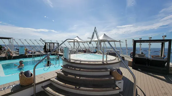 On past sailings where I was fortunate enough to enjoy The Retreat, Celebrity’s suite program, I didn’t spend too much time at the Retreat Sundeck and Poo, so I decided to do so this week. This is located all the way forward on deck 16 and offers nice views, a small pool, hot-tub, and great staff to help with drinks or food. I highly recommend the Honeycomb Goldrush for a refreshing drink. Whiskey, lemon juice, and a piece of honeycomb. This is my go-to drink when here on a hot day.