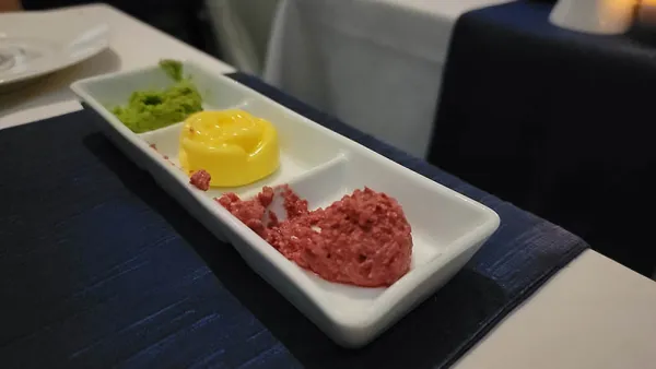 We’d never dined in Blu before, but Larissa asked the hostess if we might be able to get in and she told us that’d be no problem. When we sat down we found there were three different dips/spreads for the bread - something that Celebrity offers in some other restaurants. These change daily and are a neat alternative to simple bread and butter. Today's were salted butter, red beet, and green pea.