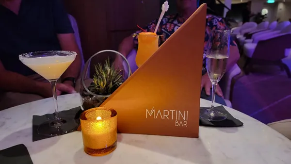 Once the show wrapped up, our group went back to the Martini Bar in the Grand Plaza. We've spent more time there on this trip than on past Edge series cruises, which I'm sure Larissa likes. I enjoy that there is so often live music playing, and the bartenders are all fantastically entertaining. Several in our group opted to have the "Coconut Cream-tini," which is a white drink with a coconut flavor and served in a martini glass. It's lighter and less sweet than most expected, and a nice end-of-evening drink. If you like martinis, it's worth committing to working your way through their menu here.