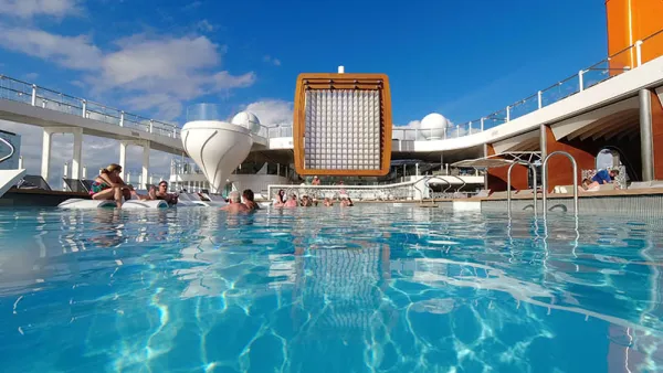 After a short dip in The Resort Deck’s pool, we went to deck 15 - the top deck, where you’ll find the Rooftop Garden. This is an open deck with a small band stage, a big screen (for movies, sports, or just pretty visuals), and wonderfully comfortable seating. There are live plants set around the outdoor couches, adding to the atmosphere.