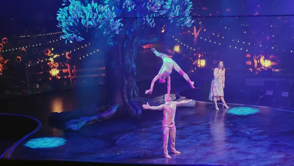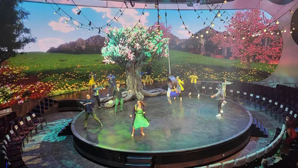 The theater show this evening was called Tree of Life, and featured a series of modern songs performed by a large cast. The show demonstrates the passing of time by adjusting the 17 million pixels of the wrap-around screen to show day turning to night, and winter to spring. In the center of the stage was a two ton tree with 2834 LED leaves, which changed colors. The roof was also adorned with color-changing lights.