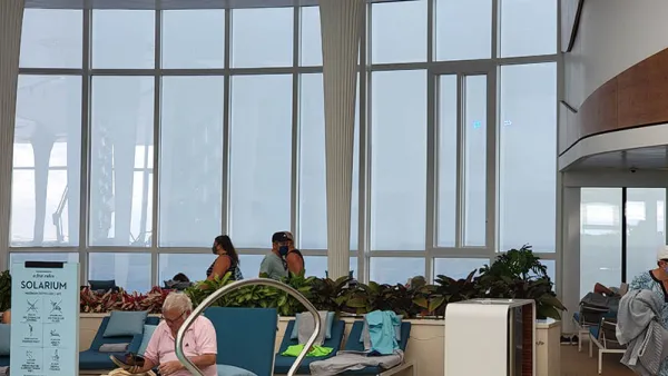 I wanted to embrace the sunshine up on deck today, and had visions of lying down in one of the floating loungers on the resort deck. After putting on my bathing suit I got out of the elevator on deck 14, walked into the Solarium…and heard rain. How? It was sunny on our verandah. We were riding the line and on one side it was raining, and on the other side it wasn’t.