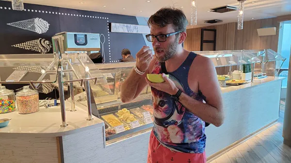 Back on the ship, we headed to the solarium…with a brief detour for ice cream. The Oceanview Café has a section near one end that is open during most of the day and night that has a selection of baked goods as well as a nice variety of ice cream. I had to test this out of course.