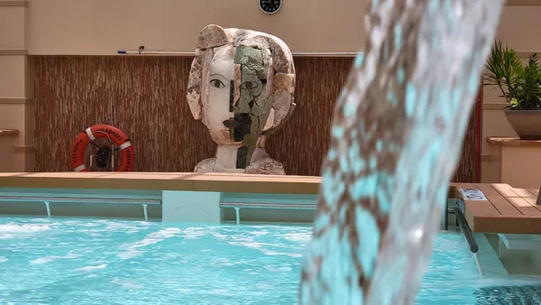We arrived to the Solarium (with now-empty ice cream bowls) and found a handful of guests enjoying the space. Every Celebrity ship has one of these enclosed pool areas, and while the layouts, specific features, etc. vary, they’re all very peaceful areas where the temperature and humidity are such that you feel like you’re outside-ish, but always comfortable. Soothing music combines with my favorite quality of the Millennium-Class solariums: the water spouts in the thalassotherapy pool.