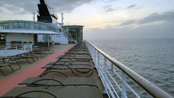 At around 5pm the Captain announced we were dropping lines and about to sail away. On a “normal” cruise this might mean a bunch of guests on deck enjoying the view and perhaps some live music. With so few people onboard however, and many presumably showering after a day on land, there were very few out by the pool as we pulled away and headed back to sea.