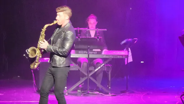 Tonight’s main theater performance was by a sax player named Tommy Proulx. He is an undeniably talented man, who absolutely rocked a number of hits on soprano, alto, and tenor sax. I’ll confess that his style of music (sort of a smooth jazz sound) isn’t my thing – but he can really play. At one point he had a ‘dueling sax’ sort of playoff with one of the sax players in the house band, who he praised a lot.