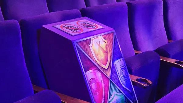 From a technical standpoint, one of the things that I found amazing was the ability to coordinate these in close-quarters, where there is no line of sight to the sky. See, usually, this would be done by GPS, but there's no way these devices could lock onto GPS signals from the lower decks of a cruise ship. How did they do this? Some seats in the theater were blocked off and contained show-themed boxes. These boxes have some sort of equipment that the drones use to understand where they are within the theater.
