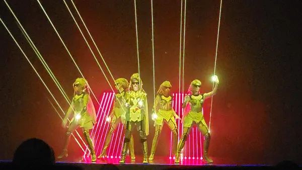 Lume could seemingly emit yellow lasers from her hands as she went about the stage, as could the team of...other Lumes? I don't mean small laser pointers in their gloves, but powerful lasers that emitted a highly visible beam through the theater (though I'm sure a hazer was in use cloud the air). The real power here was in the choreography, because those lasers were simply too powerful to come from the performers. They were being beamed AT the performers, and they had to be perfectly on their marks and in perfect sync, in order to ensure the lasers were always hitting their hands. More impressive? We heard that the actor playing Lume was changed out at the last minute, and the performance we saw was only after a week or two of rehearsals, during which time she was also performing "The Book", a show in two70, the aft multipurpose venue.