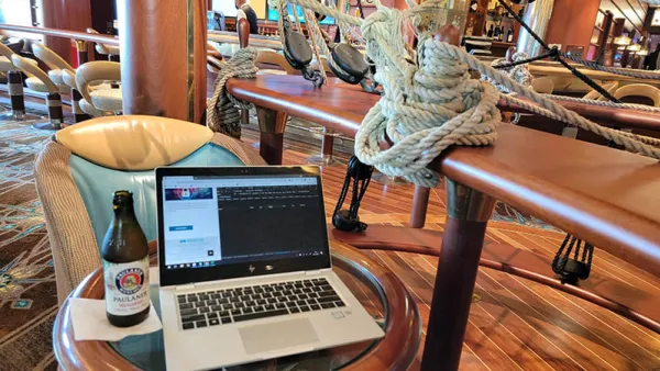 Just before we left the port I had some work to do so I sat at the Schooner Bar, one of the "vaccinated only" spaces on the ship, to do some work...and sample beer. It's nice having these vaccinated spaces where masks aren't required - though I'm not sure how long that will last. I finished my beer, and work, and got changed before we dropped lines.