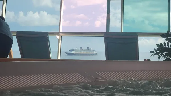 Usually as we sail I'm rushing to see and do it all, unpack, etc. On this trip though there is little to unpack (it's just two nights), and after a brief Facebook Live video, I jumped in one of the Solarium hot tubs to relax my back as I slept a bit funny last night. As I watch the port pass us by (that's how that works, right?) we approached Disney Fantasy, which was anchored just off the coast. While relaxing I chatted with a few folks in the tub and it seems there is a nice mix of folks onboard - some big cruisers, agents, etc, but some with little cruise experience - including a couple I'm overhearing at the bar as I type this.