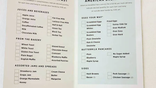 I also noticed they're really pushing room service. The menu was laid out prominently, though there is still a charge. What there is not a charge for is continental breakfast to your room - which we like taking advantage of as it serves as a forced alarm clock.