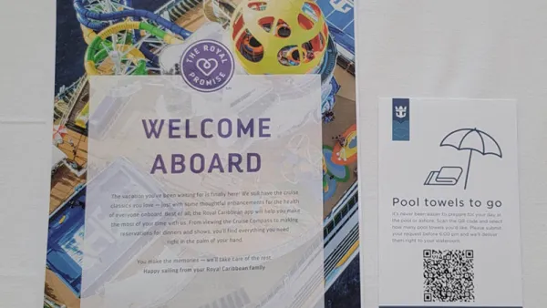 It's been since Jan of 2020 since we've been on a Royal Caribbean ship, so after being on four Celebrity cruises since then, it was quite different - and I've never been on Mariner.. The Royal Promenade is beautiful lit, as on all their ships, and it looked like there were as many crew members as guests. We went right to our rooms to find a welcome back letter as well as a QR code which you could scan to request towels for tomorrow, when we're at Coco Cay. That's a neat touch, as it allows you to request however many you need without finding your stateroom attendant or leaving a note.