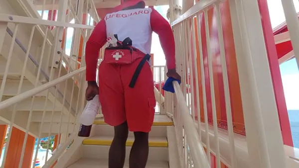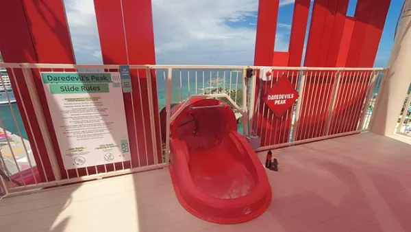 I followed the signs and got to the base of Daredevil's Tower, a colorful structure that you can see even from the neighboring island of Great Stirrup Cay (NCL's private island). Signs at the base of the stairs confirmed what I'd suspected: if you want to enjoy these slides you'll be getting your steps in for the day. I climbed up, and noticed ahead of me was a lifeguard who was wiping down all of the railings with disinfectant - something it looks like they do each time guards rotate through their positions.