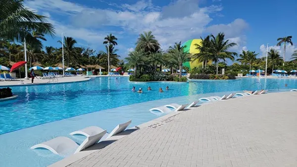 Our first stop was to the Oasis Lagoon, which is a 33,175 square foot pool (the largest in the Caribbean) that has a gradual entry area, a swim-up bar (featuring 'dry seating' on the other side as well), and is surrounded by sandy areas with shaded loungers. The pool is so large, with so many enclaves and sections, that a bridge goes over the middle of it so you don't have to walk all the way around. We set up shop in the sand and had some drinks at the swim up bar. As much as I'm not a big "hang out by the pool" person, I really liked this. Good drinks, warm air, shade, and comfy seats in the water. What's not to like? One neat touch is that the entrance to the pool as well as the area around the bar have a somewhat padded feeling, and I can imagine that if you're standing in the pool for a long period, perhaps socializing, this is a nice feature.