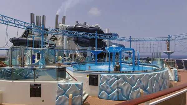 The main pool is called The Atmosphere Pool, and it's pretty large, with a shallow-water 'bridge' of sorts in the center, neat fountains, and platforms on which you can lounge, which are surrounded by shallow water. Once again, several hot tubs are around this pool, including those on the upper deck right along the edge, providing ocean views. I actually really like the look of this pool deck - it's modern but welcoming. This area feels more like a nice resort than something found on a ship with families.