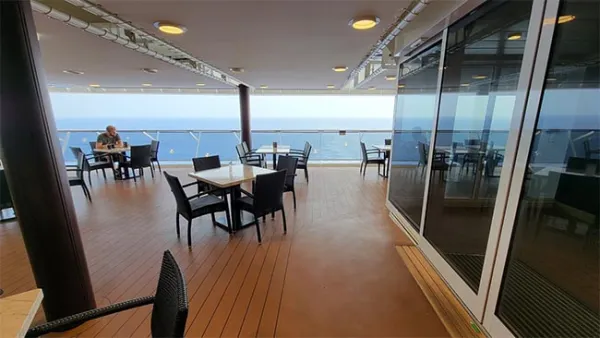 One box Meraviglia's buffet venue does check is outdoor seating. I may not remember or pick up on every detail of every ship I've been on, but I always look for outdoor seating at the buffet and am happy to see it here. On this ship, the glass wall/railing is tilted, which I completely failed to capture in the below photo, but it looks nice.