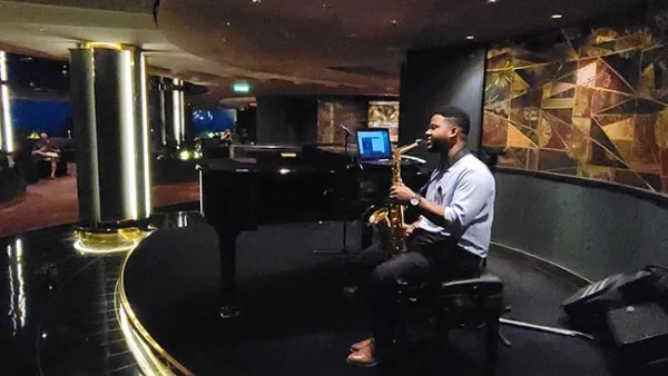 Conversation and drinks were good, but this space could stand to have a bit more ambiance - same for the restaurant one deck above. On Seaside they combined these spaces so that you had two deck floor to ceiling windows, and the restaurant was almost like a loft overlooking the lounge. On Meraviglia it feels a bit contained, and lacking in defining features. A couple small flower arrangements on tables would help some. They do sometimes have live music here, and as conversations drew to a close, a saxophonists arrived, which we enjoyed - though this only solves for ambiance when someone is actively playing.
