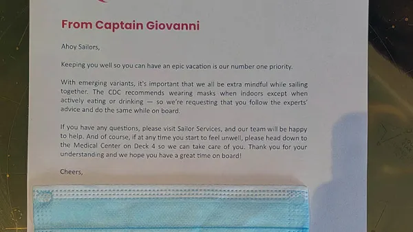 Previously, we stepped on the ship and almost all guests were maskless. Crew wore fabric masks indoors. This time the crew all wore KN95 masks, and many guests - though not all - were wearing various face coverings. We went right to our room to drop off luggage, and found two masks and a note from the captain.