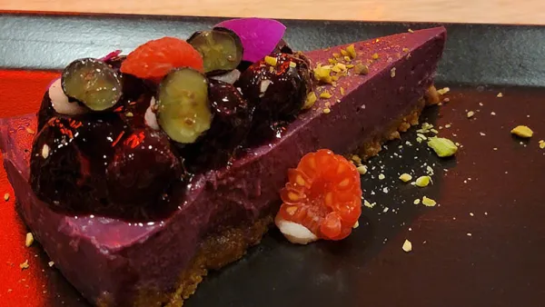 I had a simple impossible burger, with great fries, a side of shishito peppers, and vegan berry cheesecake for dessert. We ate quickly, and the wait staff, Paul and Mariana were kind enough to help us get through our meal in a bit of a hurry so we could make it to Cocktails with the Hostess.