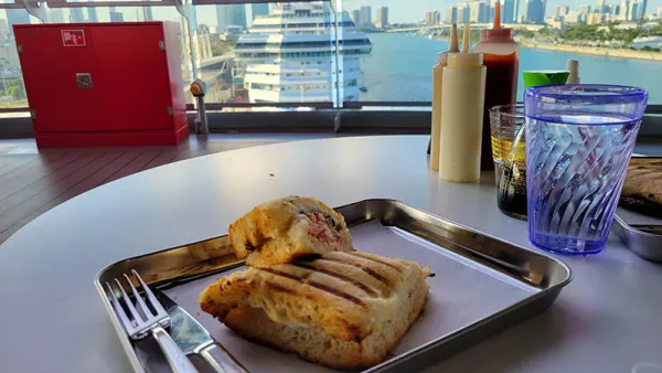 We were pretty hungry after boarding, so we grabbed lunch at The Galley, which is the casual “food hall” style eatery on deck 15. Today though, with infection rates up on land, we did things a bit differently and ate outside. This is another way in which this venue shines. We were able to sit outside, enjoy a nice view, and a server took our order, then brought us our food. I had a simple buffalo mozzarella sandwich from Hot Off the Press and Larissa had…I don’t know, I was hungry and focussed on me, myself, and my sammich.