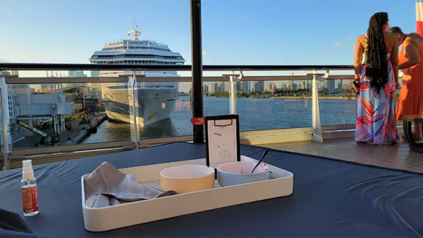 The next few hours we were still feeling out the situation onboard, and with the cool temperatures (relative to South Florida - it was in the low 70s) we went to The Dock, a large outdoor area with a bar, day beds, mez carts, and relaxing music. I could have fallen asleep there if it wasn’t for the excitement of being back at sea.