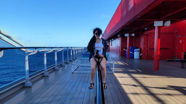 We also hit up the outdoor equipment around the Athletic Club, but that was more fun than fitness before heading to The Dock for a gorgeous sunset while doing a live video on YouTube and Facebook. Check it out if you want to know more about our cruise, and be sure to subscribe!