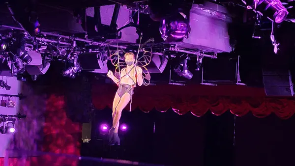 Not another bad play on words in my headings, Ships in the Night is a show in Scarlet Lady's Red Room, which is the closest thing this ship has to a theater. Depending on the event, it may be configured with seating on two sides facing a stage, seats facing each other with a center performance area, or completely open, as it was for the Unnamed Danceshowpartything which you can see in our ship tour. For tonight's show things were configured like a traditional theater - and this was, by far, the most traditional-style show on the ship. Still though, Richard Branson's Virgin made sure to do it their way.