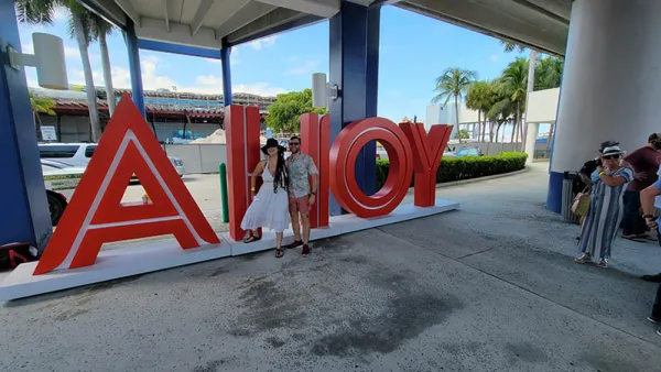 We arrived at PortMiami to find a long line of people waiting for the first stage of embarkation: COVID testing. While in line we registered on a website for the test ahead of us. Fortunately, the long line was in the shade and moved reasonably quickly. This was briefly broken up by a nice photo-op.