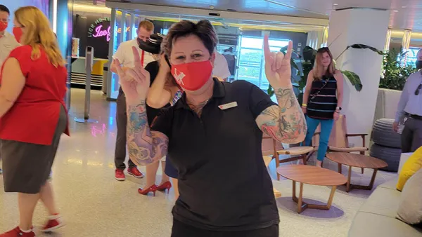 Our registration was confirmed, along with our vaccination status (all guests must prove they're fully vaccinated in order to sail with Virgin) and we walked to the next building where we saw the gangway, I waived to Tom McAlpin, Virgin Voyage's CEO, and we were onboard. Overall, from arrival to being on the ship was probably about an hour and a half, though to be honest, I didn't time it.
