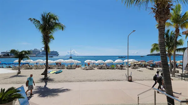 On recent visits here we spent our time at Holland House Hotel, which is located in the center of Great Bay Beach. We stayed there for several nights in June, but it’s also a wonderful place just to spend the day. Anyone can order food and drinks, or, if you want to lounge, they’ll provide beach chairs, umbrellas, two drinks, access to the restrooms, an outdoor shower, and WiFi, for $25.
