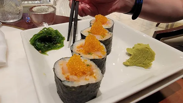 As I waited for Larissa to get ready for dinner, I found myself having a seat at this restaurant for a snack, which turned into a meal. Sushi here is price a la carte, and is very reasonable. Many four-piece rolls are under $4, some appetizers are offered complimentary with a drink or food order, and there was a nice selection. You can see the current menu here.