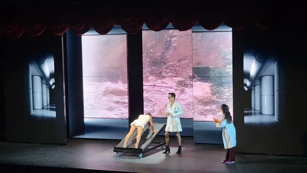 To be honest, I felt the show started a bit slow, but maybe I was just tired. The host of the show opines on topics ranging from love, to the quirks of millennials and unique challenges of modern culture. The scenes are tied together with singing by the host and others, coordinated dancing, and some acrobatics. Songs were takes on pop-songs of various vintages - in many cases Postmodern Jukebox arrangements. The talent was solid, and the set was really impressive. Giant LED panels suspended from the ceiling move around the stage as the vibrant displays are painted with images that made it often impossible to discern when the panels were moving and whether silhouettes of dancers were on the screens or in front of them.