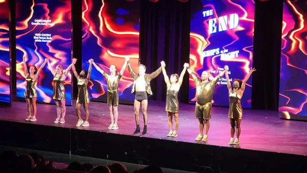 Not another bad play on words in my headings, Ships in the Night is a show in Scarlet Lady's Red Room, which is the closest thing this ship has to a theater. Depending on the event, it may be configured with seating on two sides facing a stage, seats facing each other with a center performance area, or completely open, as it was for the Unnamed Danceshowpartything which you can see in our ship tour. For tonight's show things were configured like a traditional theater - and this was, by far, the most traditional-style show on the ship. Still though, Richard Branson's Virgin made sure to do it their way.