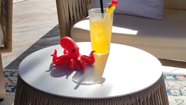 In addition to shops, there are restaurants and bars as well as a very nice pool. The pool (with swim up bar), loungers, and overall property really felt like a high-end resort - much nicer than other “port resorts” I’ve seen. There are loungers on a sandy area by the water as well, though it’s not actually a beach (as there is a rock breakwater along the edge). We ended up spending our day near the pool and at the bar, chatting with the locals working there.