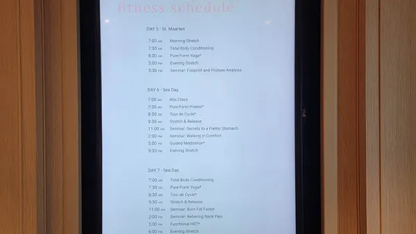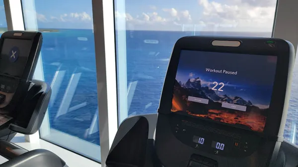 I’ve never taken a group workout class on a ship, but at some point I should try or perhaps spend time with a trainer just to see what lines offer in this way. Sky Princess’ gym does have a schedule up in the gym, as well as staff there to help and answer questions with no sales pitch of any kind.