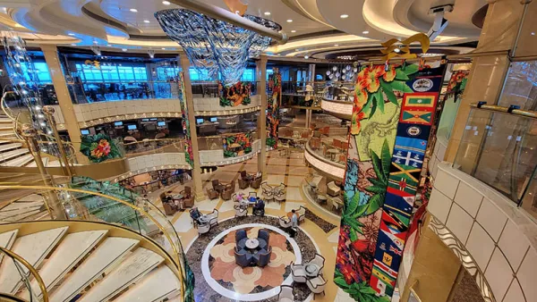 To reduce crowding at the deck where loading occurs, guests go to a restaurant in the atrium/piazza to get free tickets and then proceed to the loading area when their tickets are called.